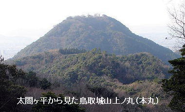 国指定史跡 「太閤ヶ平」 昭和32年12月18日指定天正9年(1581)の羽柴秀吉の包囲作戦と吉川経家の籠城とによる対陣は、鳥取城の歴史の中で最大の攻防戦であった。この戦いは、天下統一をめざして中国地方を征討しようとする織田信長と、これを阻止しようとする中国地方の雄毛利氏との対立の中で展開されたものである。 信長の派遣した部将羽柴秀吉は、姫路から但馬口を経て天正9年7月12日鳥取に到着し鳥取城背後の東北の山頂(太閤ヶ平)のこの位置に本陣を置き、左右両翼と前面の袋川沿いに各陣を布いて、2万余の軍勢により兵糧を絶つ鳥取城包囲作戦を展開した。太閤ヶ平(本陣山)は、西方前方に鳥取城を望み、左右に芳心寺に至る一帯の山々をひかえ、右方にははるかに円護寺・覚寺・浜坂・賀露に至る一帯を見下し、総本陣としては最も適した場所であった。これを迎え撃つ鳥取城は、毛利氏の一族で石見国福光城主吉川経安の嫡男経家が城将として守備しており、その兵力は芸州毛利氏よりの加番衆400と因幡国方衆1.000余であった。 毛利氏からの援軍・食糧の補給が阻止されて、包囲後3ヶ月過ぎるころには、「籠城兵糧つき、牛馬人等喰ひ候」という状況となった。ついに10月25日、吉川経家は城兵を助けるために開城し、自身は城中広間で切腹した。時に35歳であった。死の前日、10月24日に本家吉川広家にあてた遺言状に、「日本二つの御弓矢境において忰腹に及び候事、末代の名誉たるべく存じ候」と、経家は記している。織田信長と毛利氏という「日本二つの御弓矢」の正面対決による鳥取城攻防戦での切腹を、大きな名誉と感じていたのである。 この太閤ヶ平には、当時の鳥取城攻防の歴史を物語るかのように、土塁と空堀を廻らした曲輪の跡が厳然として残されている。また、この一帯は鳥取自然休養林であり、摩尼寺に至る中国自然歩道も整備され、広く市民の憩いの場として親しまれている。(現地説明板より) |