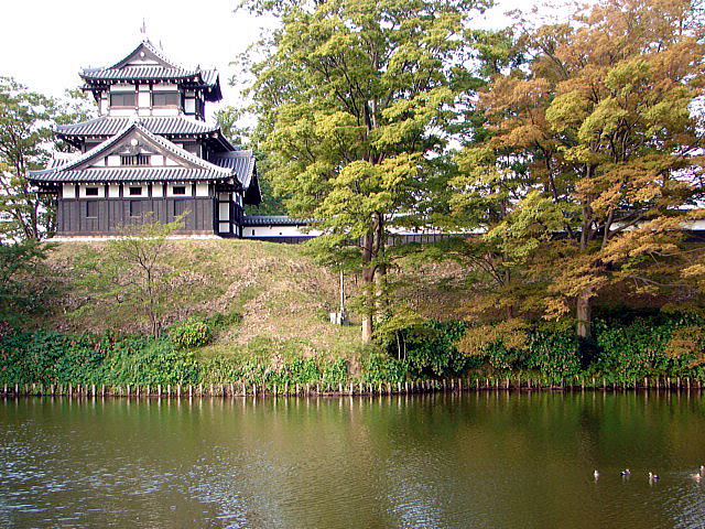 水堀と土塁、土塁上に建つ三重櫓。三重櫓は、1993年(平成5)、発掘や古絵図などの調査にもとづき模擬復元。