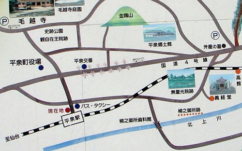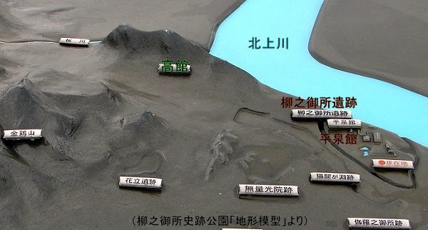 ![]() 柳之御所は、平安時代の末、(12世紀)に、平泉を拠点に繁栄した奥州藤原氏が政治を行った場所と考えられているところで、歴史書「吾妻鏡」に記されている「平泉館(ひらいずみのたち)」にあたると推定されている。 高館は、柳之御所から北西約500mに位置し、平泉で唯一の独立丘陵を形成しており、丘陵式の築城がなされている。遺構として、土塁や空堀が残る。 |
