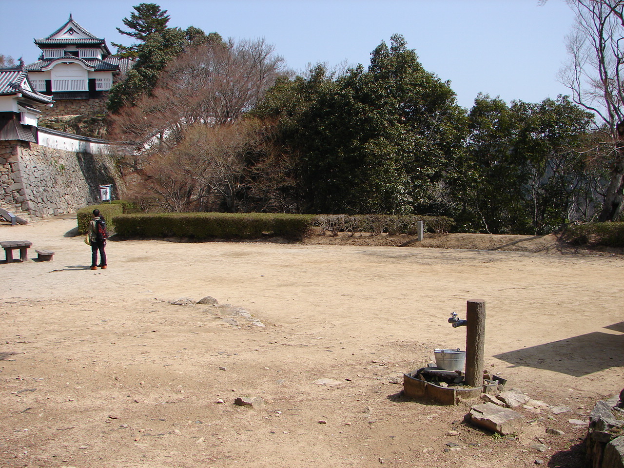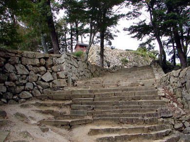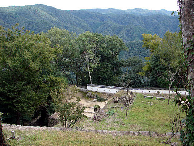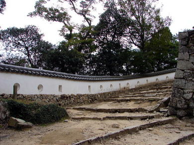 備中松山城の場合、土塀の痕跡がとぎれる大手門下の現在地にあたり、ここから天守裏の搦手門に通じる犬走りが続いている。