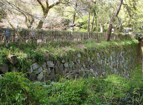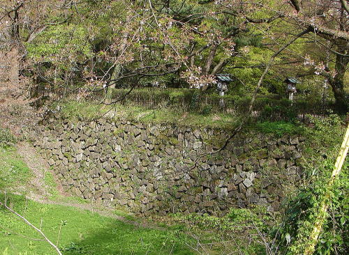 二の丸から本丸に渡る土橋の両側には、築城当時の打込接(うちこみはぎ)の乱積による石垣が残っています。石垣は、この土橋脇だけに残り、他は見られない。 内堀側の石垣の石材を調べたところ、高岡から氷見の海岸で切り出される砂岩が4割、残りは県東部で切り出される花崗岩や安山岩が用いられています。石には岩を断ち割る際にクサビを打ち込んだ「矢穴」のほか、60種類余の文様・記号を刻み込んだ「刻印」を見ることができます。 <写真左上>土橋西側の石垣。 <写真右上>土橋東側の石垣。 <写真左>内堀と土橋東側の石垣。左が二の丸、右が本丸。建物は取り壊されたが、石垣や堀はそのまま残される。 |