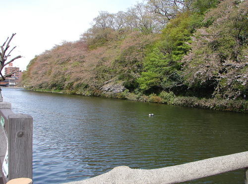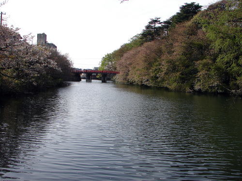 ![]() 南外濠〜大手口からの眺め。二の丸(右手)と赤い橋は駐春橋。 |