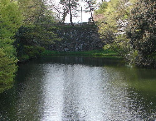 ![]() 三の丸から見た内濠〜赤い朝陽橋は、左側の本丸と右側の三の丸(民部丸)を結ぶ。 |