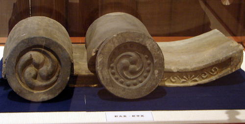 ![]() 軒丸瓦・軒平瓦〜屋根を飾る瓦については、さまざまな種類があります。しかしほとんどは丸瓦及び平瓦です。軒先を飾る軒瓦(軒丸瓦・軒平瓦)は、軒丸瓦ではおおむね三ツ巴文であり、軒平瓦では均整唐草文です。 |