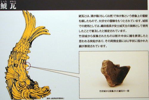 ![]() 竹田城跡にはポピュラーな軒瓦とともに、特殊な形をもつ鯱瓦も存在しています。竹田城から採集されたものは断片中央に鰭(ひれ)を表現したと思われる突起があり、その両側全面にはU字状に描かれた鱗(うろこ)が表現されています(文は情報館「天空の城」説明板より) |