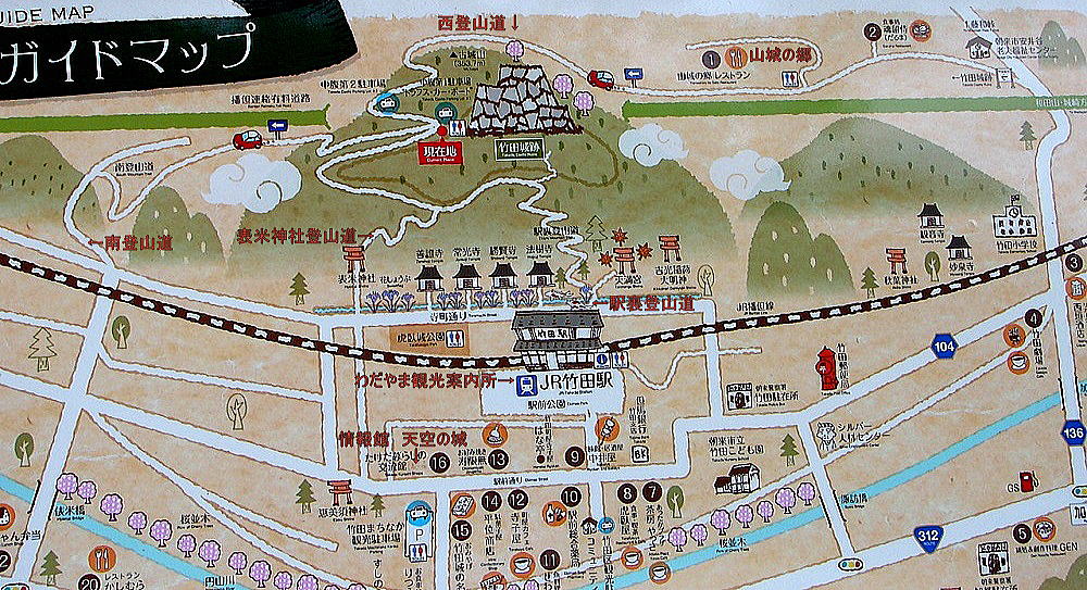 ■竹田城跡へのアクセス![]() 訪城時、竹田駅から南登山道(舗装道)経由で登城。駅からゆっくり歩いて地図の現在地まで約40分、現在地から大手門入口まで15分ぐらいです。なお、徒歩での登城口は、表米神社登山道、駅裏登山道もあります。 |