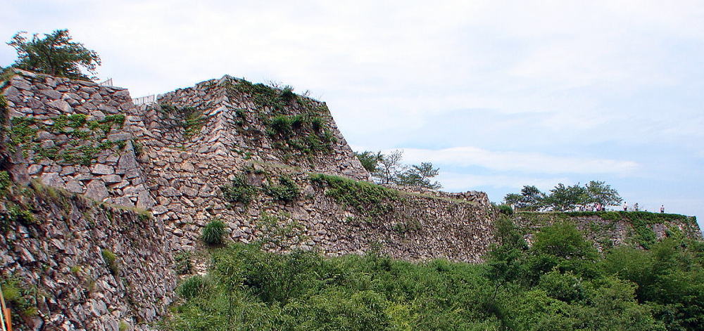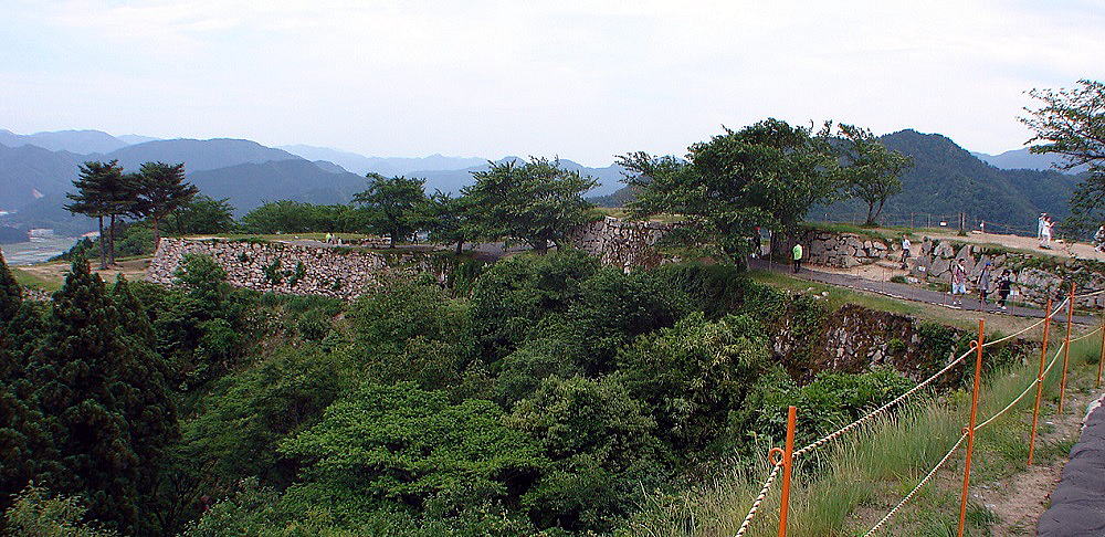 | 【遺構】 嘉吉年間、山名持豊(宗全)が播磨・丹波から但馬への侵入路に位置する要衝の地に13か年を費やして築いたものと伝えられてきた。築城当時の城には石垣はなく、曲輪を連ねただけのものであった。それが現存の完成された城郭に整備されたのは、天正〜慶長初期と推定されている。石垣は近江穴太(あのう)衆の手による穴太流石積み技法を用いた“野面(のづら)積み”である。石材は現地のほか山麓付近から集めたものであろう。 遺構は、最高所の天守台をほぼ中央に置き、本丸以下南方に南二の丸、南千畳、北方に二の丸、三の丸、北千畳を築いている。さらに、天守台の北西部には花屋敷と称する一郭があり、主郭のなかでも最も低い位置にあるため、南北には向かい合った塁状石垣列を築いている。 ![]() ▲竹田城跡東辺〜本丸から南(写真左側方向)へ、南二の丸、南千畳と階段状に曲輪が連なる。天守台は、城下町をのぞむ本丸の正面に置かれている ▼竹田城西辺〜本丸から北方向(写真では左方向)にも二の丸、三の丸、北千畳と曲輪が続く。竹田城の先端を固めている北千畳、花屋敷、南千畳の標高はほぼ同じで、標高331mに作られている ![]() |