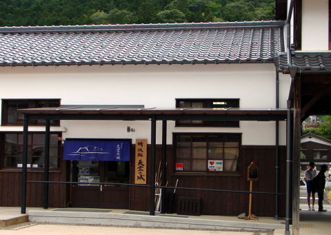 ![]() JR竹田駅(構内にわだやま観光案内所併設)〜登城に関する情報を教えてくれます。また竹田城復元模型も展示。左後方の山頂部に竹田城が築かれている。 |