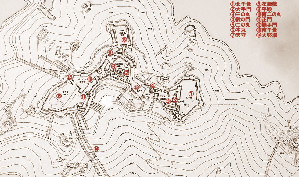 | 【縄張り(平面構成)】 天守台を中心に北千畳、花屋敷、南千畳など放射状に設けられた縄張りの規模は南北400m、東西100mに及び、完存する石垣遺構としては全国屈指。自然石を巧みに配置した穴太積みの石垣は、400年を経た今でも当時の威容を誇っている。 ![]() |