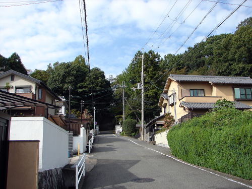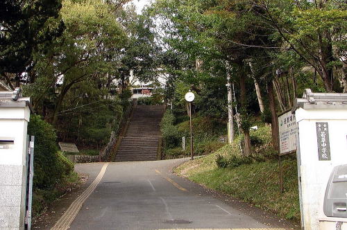 (下写真)道路の突当りが若草中学校(多聞城跡)の校門。校門手前の右側に多聞城説明板が設置。