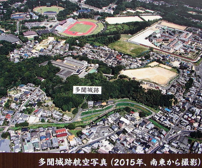 多聞城跡に建つ若草中学校は、多聞城の主郭跡(航空写真は現地説明板より)