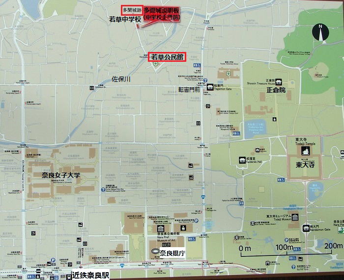 近鉄奈良駅より徒歩15分。城跡は若草公民館の北、佐保川を渡って坂を上がると、奈良市立若草中学校があり、校門を入った所に「多聞城跡」と刻まれた石標が立っています。その校舎が建つ小丘は多聞山と呼ばれ、ここに450年前、戦国の武将松永久秀が、大和を支配する拠点として、多聞城を築いた。城跡は若草中学校内にあるため原則見学不可だが、近くの若草公民館に多聞城復元模型や、多聞城、城主、歴史等についての資料展示などがあり見学できます。