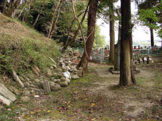■発掘調査では、石造物を再利用した石組の溝や井戸、多数の瓦などが見つかっています。また、現在でも校門の東側(下写真)には、校地一帯で発見された墓石類が手厚く供養されています(文は現地説明板より)