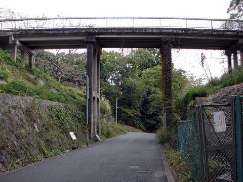 ▲堀切跡。若草中学校東側の丘陵を切断して曲輪を防御する空堀。橋は中学校(右側)と運動場(左側)を結ぶ。