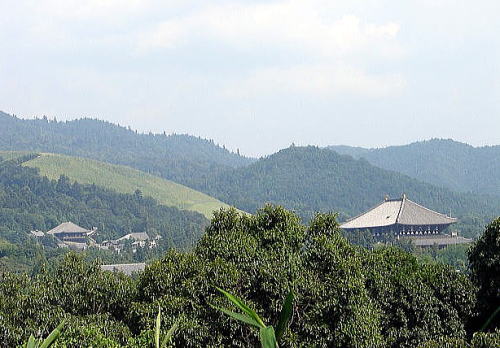 ▲城跡(若草中学校の駐車場)から望む若草山と東大寺大仏殿