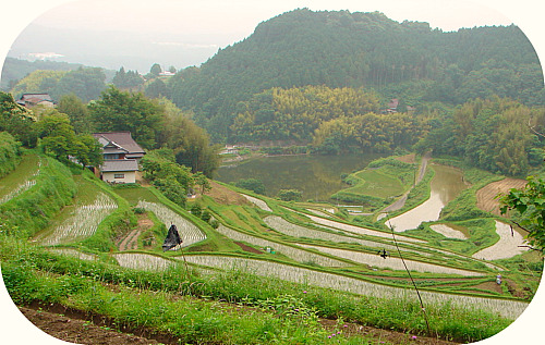 当地区の棚田面積は、88haであり日本一の面積を誇り、谷、尾根筋に広がる棚田。左奥の池は、ため池百選に選ばれている「神之淵池(かんのぶちいけ)」。