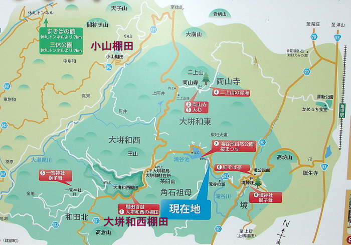 ※大垪和郵便局・駐在所の前方に駐車場(無料)があり、そこの大垪和地域活性化センターに棚田絶景ポイント地図を置いてあります。棚田公園を経由して乗用車で一周、活性化センターへ帰ることが出来ます。