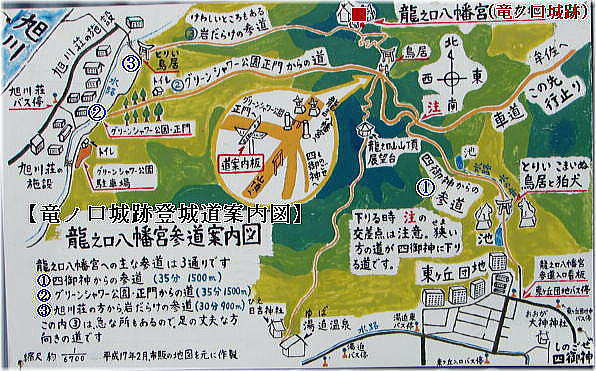 | 龍ノ口山城跡周辺図と登城道案内図 (登城口は3ヶ所あり、城跡には龍之口八幡宮が祀られている。周辺図は現地説明板に追記) ![]() ![]() |