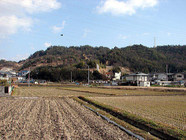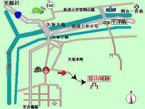城跡は、総社に向って国道180号線を行き、矢坂大橋の手前を左折し、矢坂小橋を渡り南へ少し行くと、右側に祠があり、その前から山に向って登山口まで行きました。