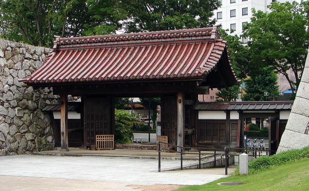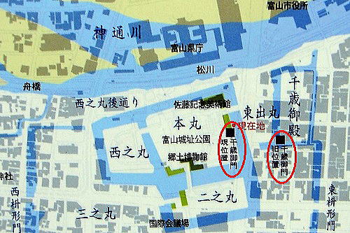市指定文化財(建造物)富山藩10代藩主前田利保(としやす)が隠居所として造営した千歳御殿の正門で、嘉永2年(1849)に建築されました。当時は、埋門と呼ばれ下図に示すとおり城址大通りの東側に位置していました。 総欅造りの三間薬医門で、屋根は切妻造本瓦葺、桁行6m、梁間1.9mになります。同一建築様式の城門は「東大の赤門」として知られる旧加賀屋敷御守殿門(国重要文化財・東京都文京区)など数少ないことから、県内はもとより全国的に見ても貴重な江戸時代の城門です。 この門は、明治時代初期に赤祖父家に移されました。その後、富山市が所有者から寄附をうけ、平成18年から20年にかけて城址公園内に移築しました。 富山城で唯一現存する千歳御殿の創建当初の建造物です。江戸時代後期の御殿正門の様式や意匠及び技法を知るうえで価値が高く、平成20年10月29日に市指定文化財に指定されました。 |