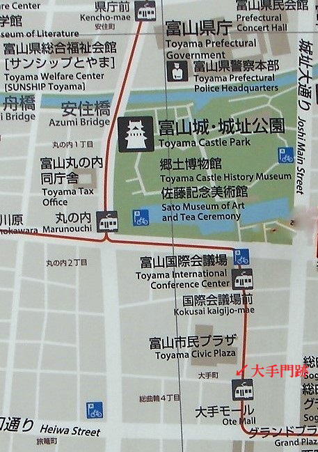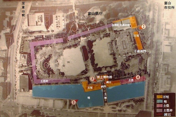 三重の模擬天守(富山市郷土博物館)が本丸枡形虎口の石垣上に建つ![]() |