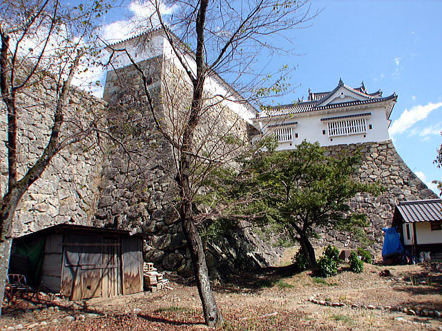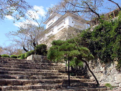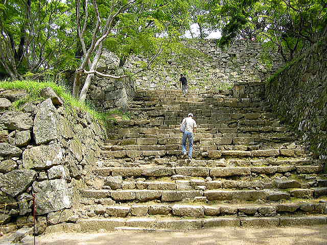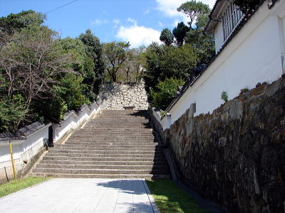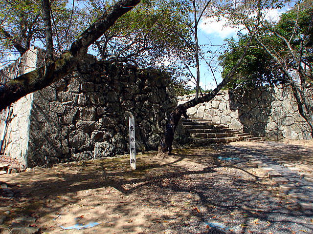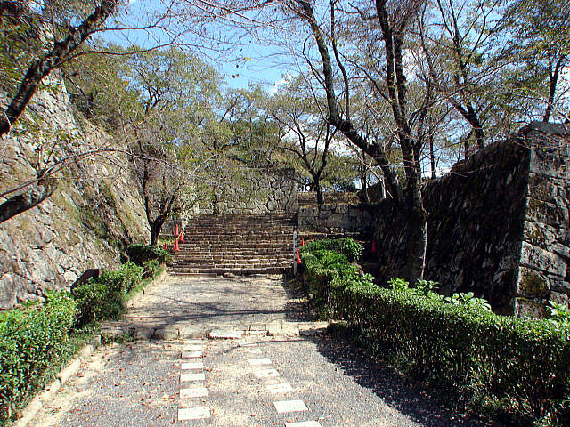 ![]() 表中門跡石段の途中から見た備中櫓 この石段を上がると四脚門跡で、その先は二ノ丸跡。 |
