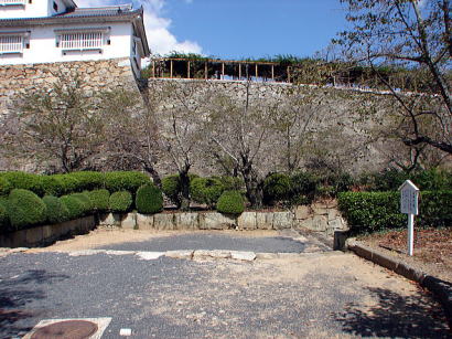切手門跡四脚門跡から右(東)に折れ曲がって進むと、本丸への入口である表鉄門跡手前に位置する。 |