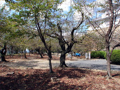 桜の馬場の段と三ノ丸石垣公園入口石段を上がりきった所。左端には、忘れ去られた石、右斜めに進むと冠木門跡、右下は公園入口石段。 |