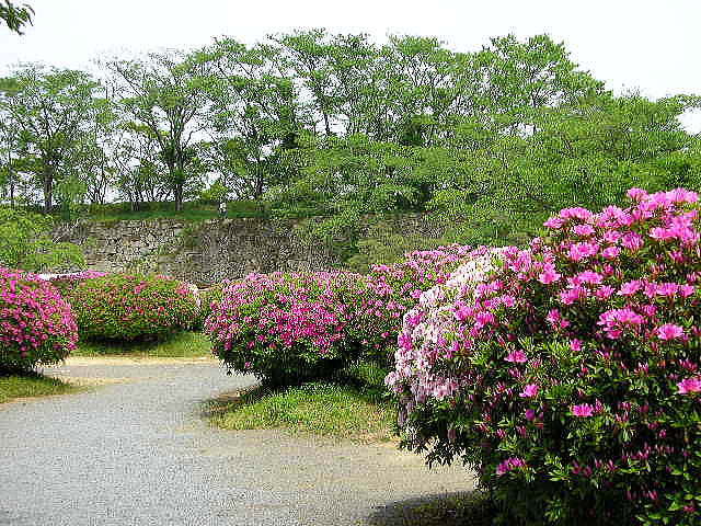 本丸跡本丸を中心に咲く約300本の平戸つつじ。後方の石垣は本丸東面の石垣で、櫓が建っていた櫓台。 鶴山公園は、「日本桜の名所100選」にも選ばれており、春には5千本の桜が咲き乱れる。 |