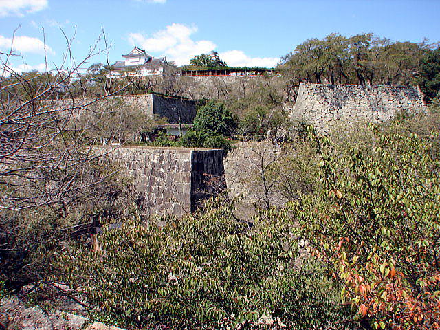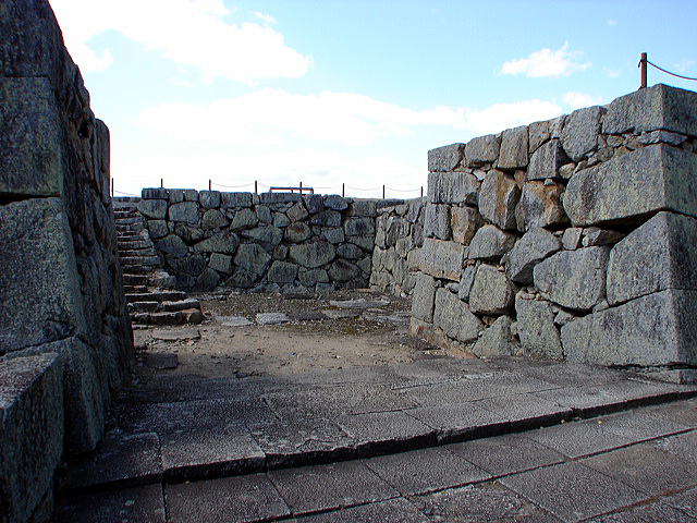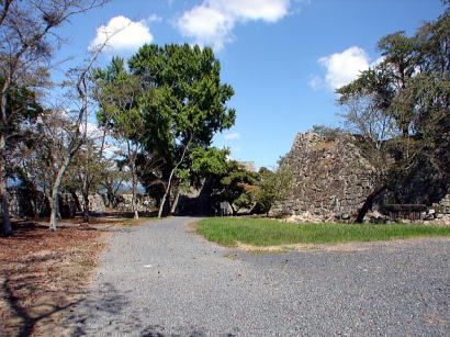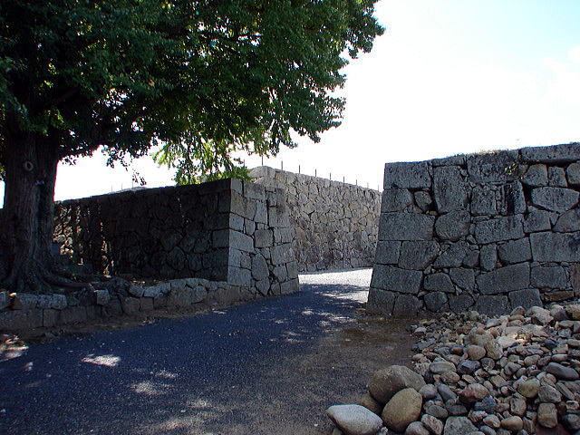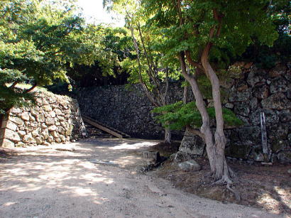 ![]() 裏中門跡 この門を通過して、折れ曲がって裏鉄門跡へと至り、容易に本丸へは近づけない構えとなっている。 |