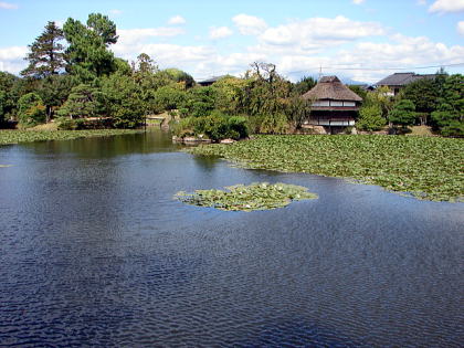 この庭園は京都の仙洞(せんとう)御所を模したもので、明暦の創園当時から伝わる建物としては余芳閣が残っています。南北に長い池に大小4つの島を配し周囲の中国山地を借景とした構成は近世池泉廻遊式庭園の典型であり、江戸時代初期の大名庭園のおもかげをよく残しています。 |