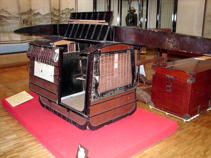 ![]() 津山松平藩主所用乗物 この乗物は、津山松平藩主が参勤交代の道中に用いたものである。駕籠の一種であるが、大名など身分の高い者が使用した豪華なものは乗物と称して区別される。 |