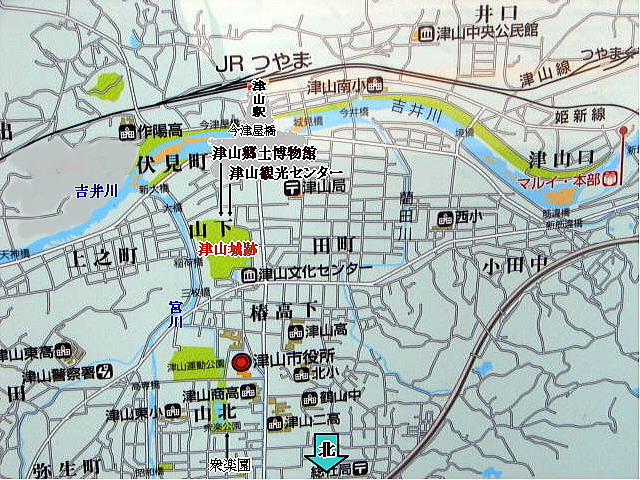 ![]() ■津山城跡〜津山駅から北へ徒歩10分 ■衆楽園〜津山城跡から北へ徒歩15分 ![]() 今津屋橋付近から吉井川越しに備中櫓を望む |