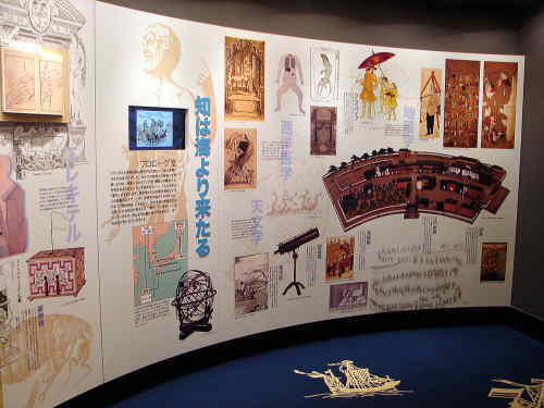 江戸時代、西洋の知識はオランダによって長崎・出島にもたらされ、「蘭学」が生まれました。プロロ―グでは知の入口となった出島をイメ―ジし、床には絵図を描いています。プロロ―グ室は、洋学の歴史を学ぶ出発点となる展示室です。 |