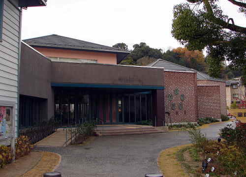 正面玄関。鉄筋コンクリート造り平屋建ての建物。左端の白い建物は図書室