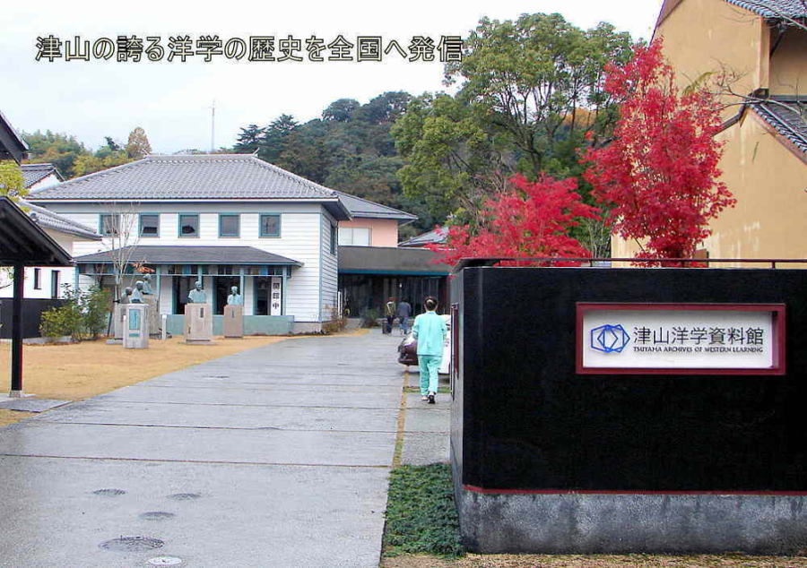 有名な医学書「解体新書」に始まる江戸蘭学の夜明けをわかりやすく紹介した資料館。津山が輩出した学者や、幕末の藩医箕作阮甫(みつくりげんぽ)の偉業を中心に構成。初めての解剖“腑分け”に驚く当時の様子や、木製の人骨模型、今も使われる医学用語の誕生秘話などを、激動の時代背景とともに展示。前庭には代表的な津山の洋学者の銅像が並ぶ。前庭後方の白い建物は洋学に関係する図書を集めている図書室。さらにその後方が津山洋学資料館。