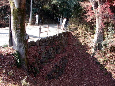 ![]() 北門と土橋 石垣は、野面積みと呼ばれる自然石をそのまま積上げる技法で積まれており、背面には栗石と呼ばれる礫が使用されている。このような石垣の技法は、西日本から導入されたものであり、現在見られる石垣は、武田氏滅亡後に設けられたと考えられる。 土橋を渡った先は、味噌曲輪・隠居曲輪となる。 |