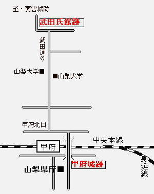 ![]() <武田氏館跡へのアクセス> JR中央本線「甲府駅」北口よりバスで約10分。武田神社下車すぐ。 (甲府駅北口より北へ約2,2キロメートル) 地域別訪問城に戻る |