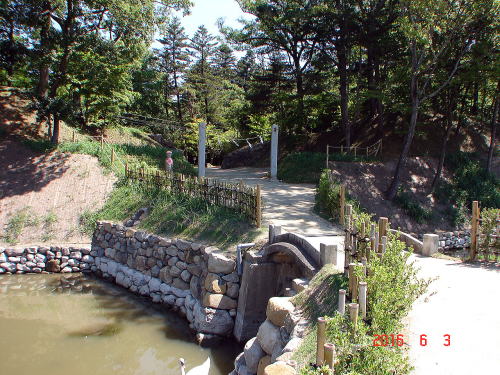 @![]() 大手門跡と土橋 幅広い堀は土橋で渡る。 |