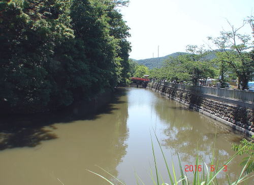 ![]() みその橋側から見た水堀 朱色の橋は神橋。館の東・西・南の三方に水堀をめぐらしている。 |
