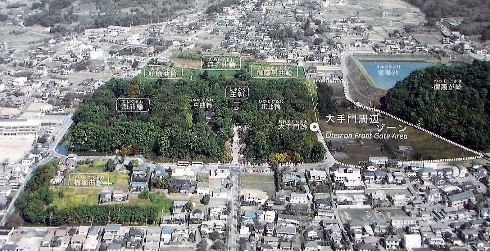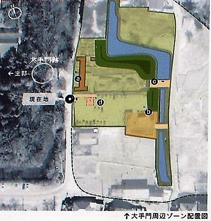 ![]() 大手門跡から大手門周辺ゾーンを望む 前方に見えるのは大手石塁。 |
