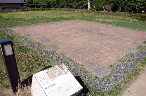 ![]() 厩とみられる建物跡(d) 平面で表示した掘立柱建物跡は、江戸時代の建築書に記された厩建物の形式と類似し、古絵図にもこの付近に「御厩」の存在を示す表記がみられることから、厩跡として推定し整備を行っている。 |
