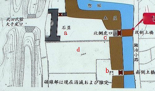 ![]() 大手門周辺ゾーン配置図(現地説明板より転載) <整備箇所> a大手石塁 b惣堀・土塁・南側土橋 c北側土橋・虎口石階段 d厩(うまや)跡 武田氏館の正面玄関にあたる大手門の東側には惣堀と土塁で囲まれた曲輪の存在が確認されています。整備前の発掘調査によって、武田氏滅亡後に築かれた石塁などとともに新たに造営された曲輪であることが明らかになりました。 曲輪内の広場のうち上段部では、惣堀に架かる北側土橋の曲輪側から石階段が発見され、その下段に付設されている南側土橋では門礎石が確認されています。土橋から館跡へ向かって進むと、大手土橋の前に武田氏滅亡後に築かれた大手石塁が存在しています。 ▼別の大手門周辺ゾーン配置図(現地説明板より掲載) ![]() |