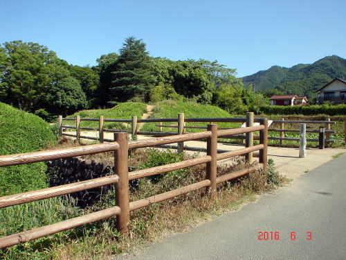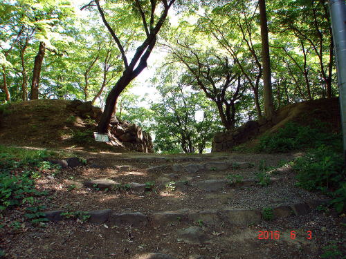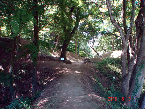 B![]() 中曲輪から西曲輪への道 中曲輪と西曲輪は現在土橋によって結ばれているが、かつては橋が架けられていたという。 |