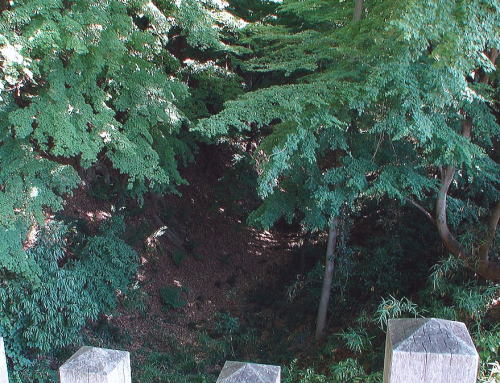 ![]() 天守台付近の急崖 中曲輪と西曲輪を隔てる空堀。天守台が位置する中曲輪北西側隅を空堀越しに西曲輪側から見る。 |