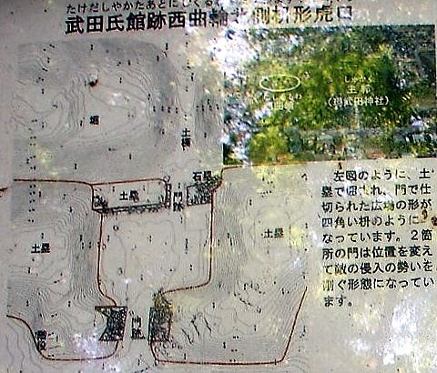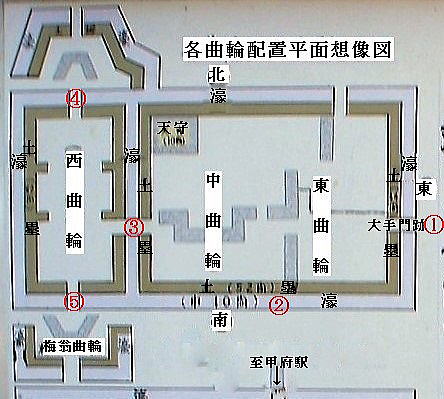 ![]() 西曲輪北側枡形虎口の平面図(現地説明板より) 図は、土塁で囲まれ、門で仕切られた広場の形が四角い枡のようになっています。2箇所の門は位置を変えて敵の侵入の勢いを削ぐ形態になっています。 西曲輪は、武田信玄の長男であった武田義信と駿河の今川義元の娘との結婚に合わせて天文20年(1551)に新造された義信の居館。義信は謀反の罪に問われ、東光寺で自害したため、西曲輪のその後の利用は明らかになっていない。 |