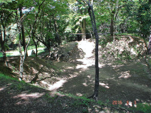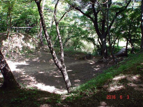 C![]() 西曲輪北側枡形虎口 右写真の、下側の門跡を館内より見た様子。奥後方には、土橋、堀が位置する。現在地は、西曲輪の北側に位置し、枡形虎口と呼ばれる出入口の構造が残っている。 |