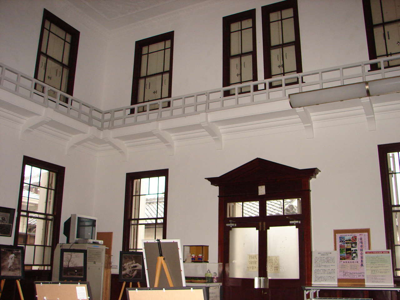 「街角ミュゼ牛窓文化館」内部〜内部は吹き抜けとなっており、高く開放的で、壁は漆喰仕上げ。また、上部の窓を開閉するための、キャツトウォークと呼ばれる幅の狭い廊下が付けられている。