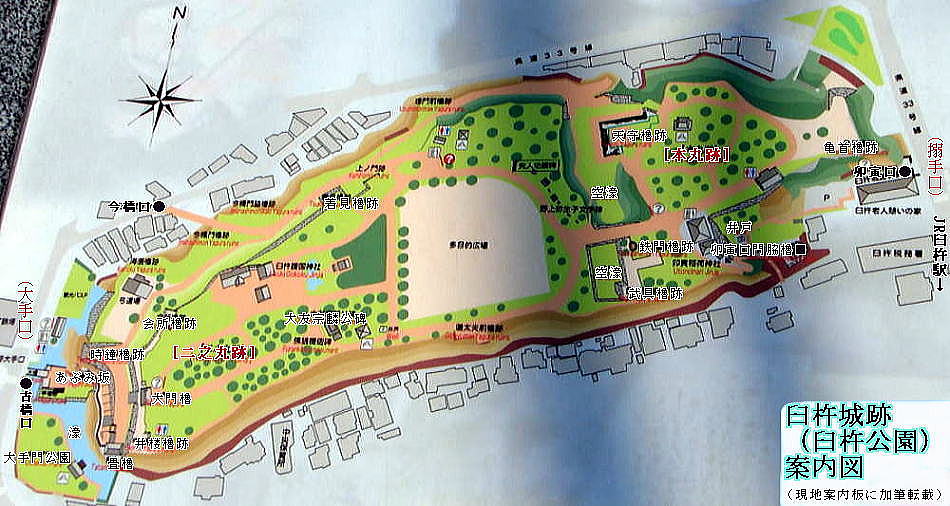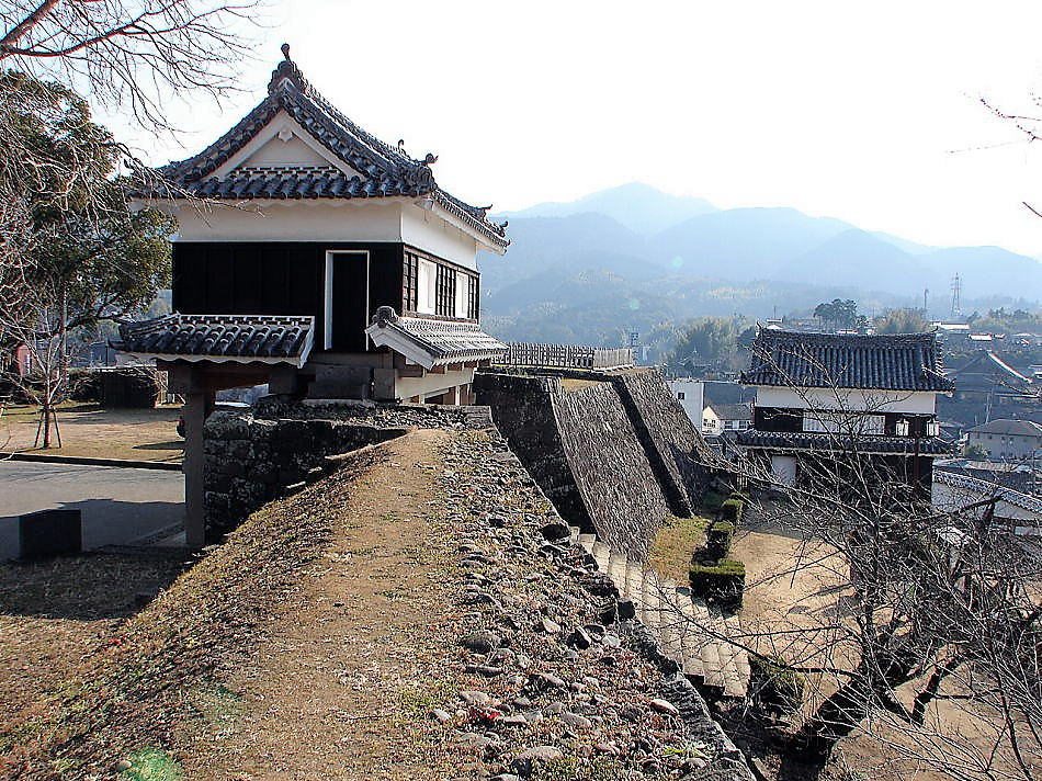 本丸跡から鉄門櫓跡(左側の石垣)後方の二之丸跡を望む。二之丸と本丸は土橋で結ばれており、土橋の両サイドは空濠となっている。 <二之丸> 『江戸時代、空濠から西側一帯を「二之丸」あるいは西の丸と呼んでいました。 臼杵城は、大友宗麟によって建設されましたが、その当時の「二之丸」の姿は明らかではありません。しかし、近年の発掘調査では、弘治3年(1557年)、天正16年(1588年)の火災で焼けた土層が確認されましたが、天正の火災層からは瓦が一点も出土していないことから、瓦葺きではなかったこと、壁土に漆喰を用いていたこと等が判明しました。 また、その層からは景徳鎮(中国)製の青花磁器(せいかじき)や赤絵金襴手碗(あかえきんらんてわん)など、多くの高級陶磁器出土していることから、大友時代の城主居館が存在していたことが伺えます。 大友氏改易後、豊後国は豊臣政権恩顧の大名である福原直高、太田一吉が相次いで入城します。これ以降臼杵城は「織豊系城郭」と呼ばれる、石垣や天守櫓等の豪壮な造りを重んじるスタイルへと変化していったと考えられます。 その後、慶長5年(1600年)の関ヶ原合戦直後、美濃国郡上八幡(現在の岐阜県)から転封してきた稲葉氏によって、さらなる改修が実施されます。大門櫓(復元)、帯曲輪や今橋口などもこの時に整備されました。 その後、延宝4年(1676年)、当時の藩主・稲葉景通(5代目)が本丸から二之丸に御殿を移してからは、こちらが城の中心的機能を担い、明治維新まで使用されました』 (城内説明板より) |