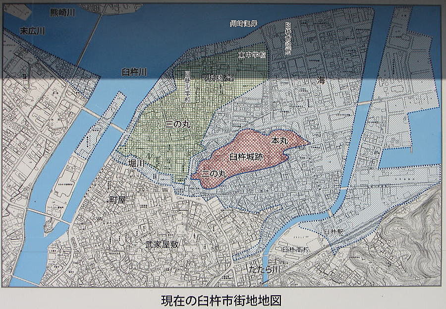 ■現在の臼杵城周辺図 ![]() 現在は埋め立てが進み、かつての海面には人家や公共施設、学校などが建ちならんでいる |